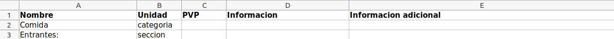 Cuando desee crear una categoría debe escribir el nombre de la categoría debajo de la columna “Nombre” y “Categoría” en la columna “Unidad”.