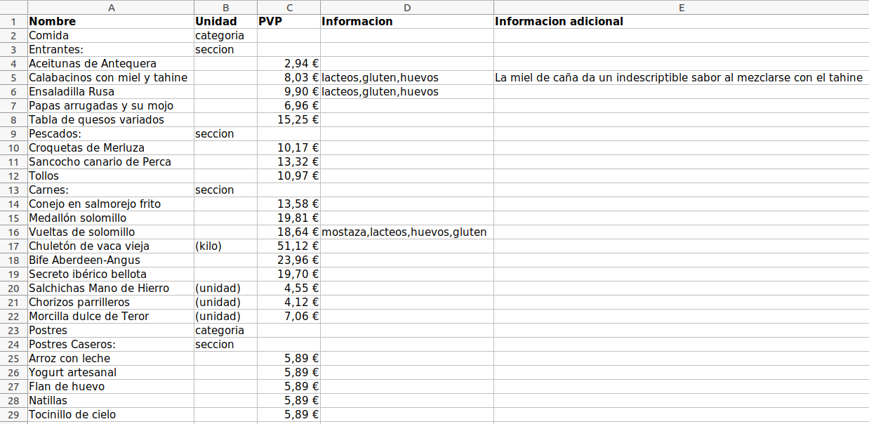 Para aclarar esta sugerencia, puede definir las categorias Platos, Postres, Bebidas y Vinos. Y dentro de la categoría Platos, las secciones Entrantes, Carnes, Pescados, Pastas, Arroces, etc.